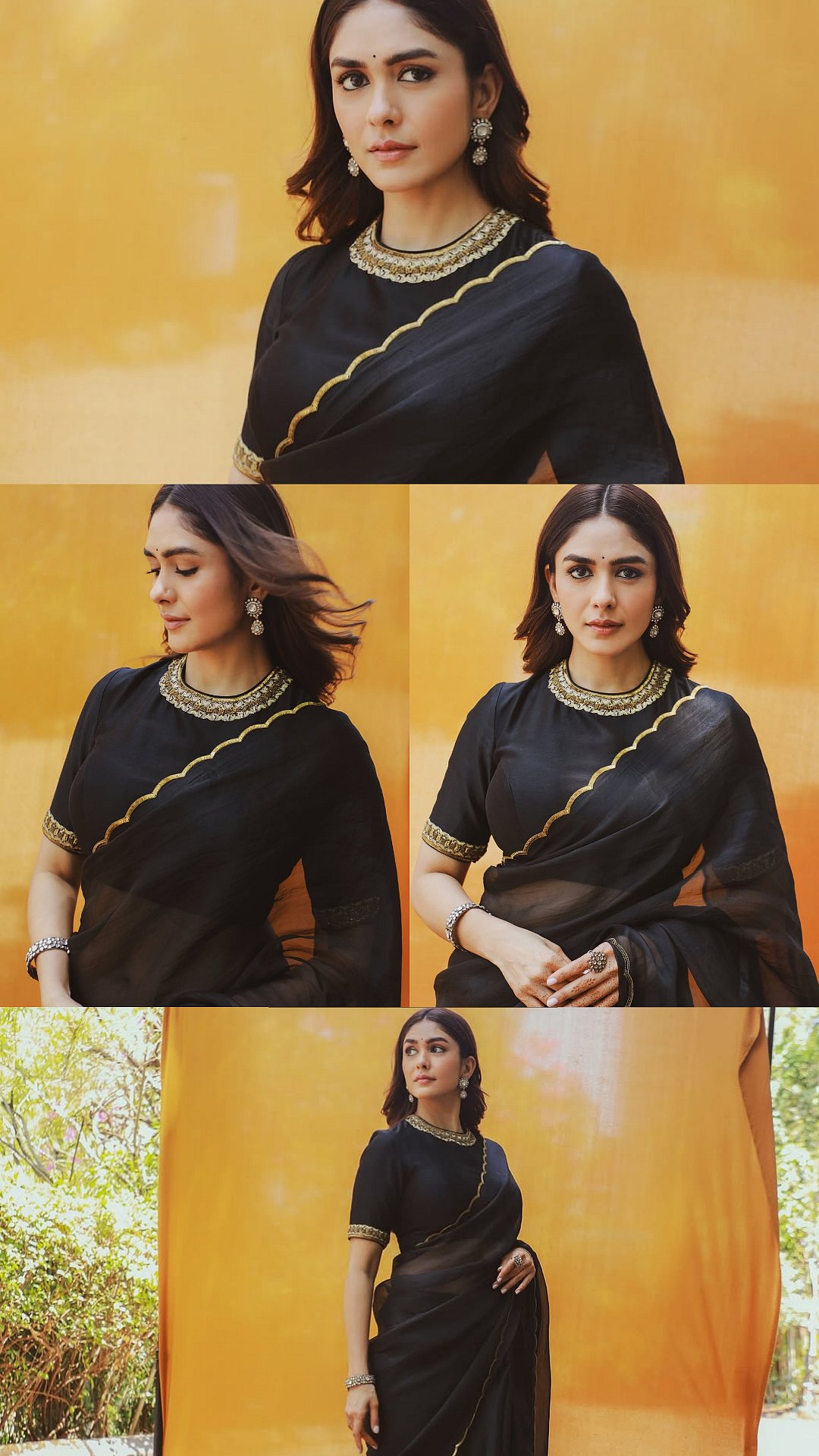 Mrunal Thakur exudes timeless elegance in a stunning black saree, proving once again that classic silhouettes never go out of style.The organza silk saree by Mimamsaa, priced at ₹60,000, features delicate woven and embroidered detailing that adds a subtle richness to the otherwise minimal look.Its fluid drape and sheer texture lend a graceful, almost ethereal movement, making the ensemble both lightweight and luxurious.She pairs it with a structured Munga silk blouse that complements the saree’s softness while adding a refined, tailored finish.The blouse’s elbow-length sleeves and minimal embroidery keep the focus on clean lines and understated sophistication.The choice of subtle gold-toned footwear by Stoffa seamlessly ties the entire outfit together.Her makeup is kept soft and radiant, glowy skin, defined eyes, and muted lips, perfectly aligning with the saree’s elegant vibe.