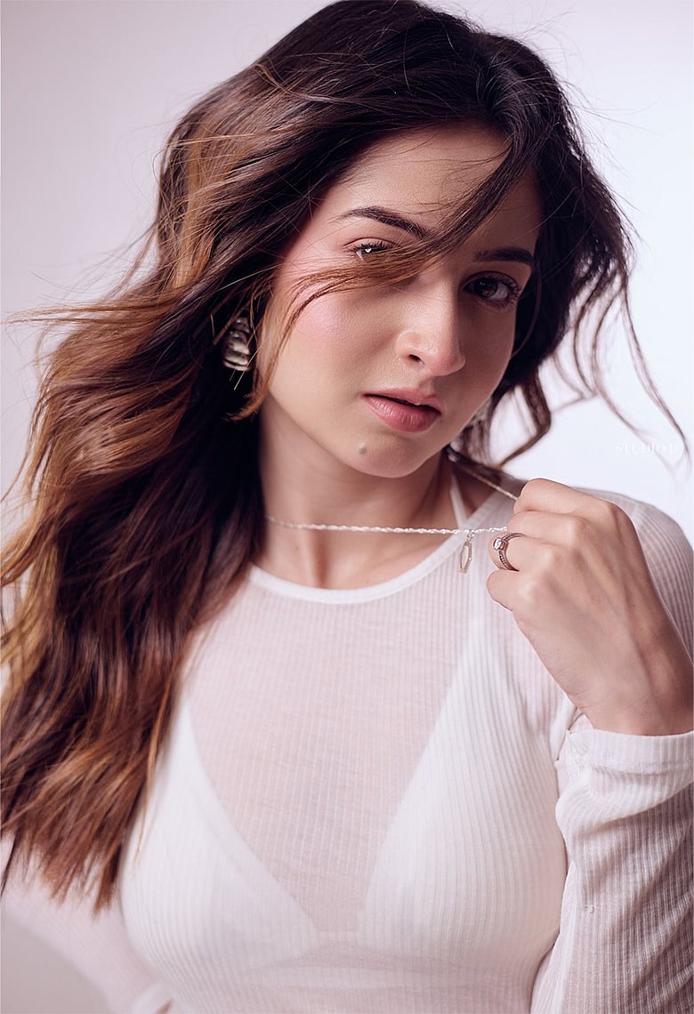 এই লুকের মূল আকর্ষণ তাঁর মোনোক্রোম আউটফিট। উপরের অংশে শ্রীমা পরেছেন একটি শিয়ার রিবড, বডি-ফিটেড ফুল-স্লিভ সাদা টপ। এর সঙ্গে জুটি হয়েছে হাই-ওয়েস্টেড প্লিটেড মিনি স্কার্ট।