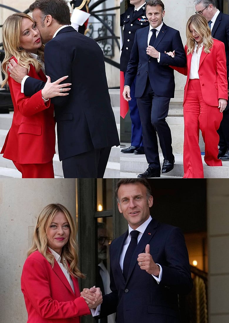 ফ্রান্সের প্রেসিডেন্ট মাখোঁ বরাবরই স্যুটেড লুকে ড্যাপার স্টাইলে দেখা দেন। এদিনও তিনি পরেছেন নেভি স্লিক কাটের চমৎকার ফিটিংয়ের সিঙ্গেল লেপেলের স্যুট, মাচিং টাই, সাদা শার্ট আর ঝা চকচকে ড্রেস শুজ। আর মেলোনি গিয়েছেন টকটকে লাল কিছুটা বেলবটম কাটের প্যান্টস্যুটে। সঙ্গে আছে সাদা শার্ট। উঁকি দিচ্ছে কালো কিটেন হিলস।